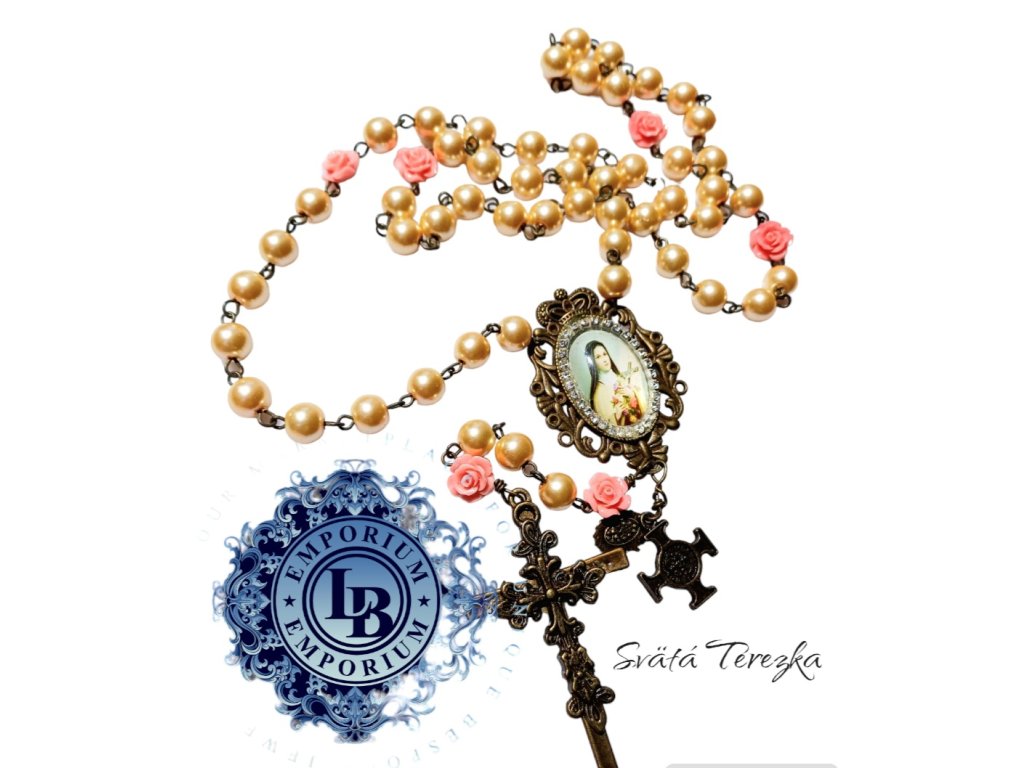 Dlhý perlový ruženec s medailónom svätej Terezky s Benediktínskou Medailou.
