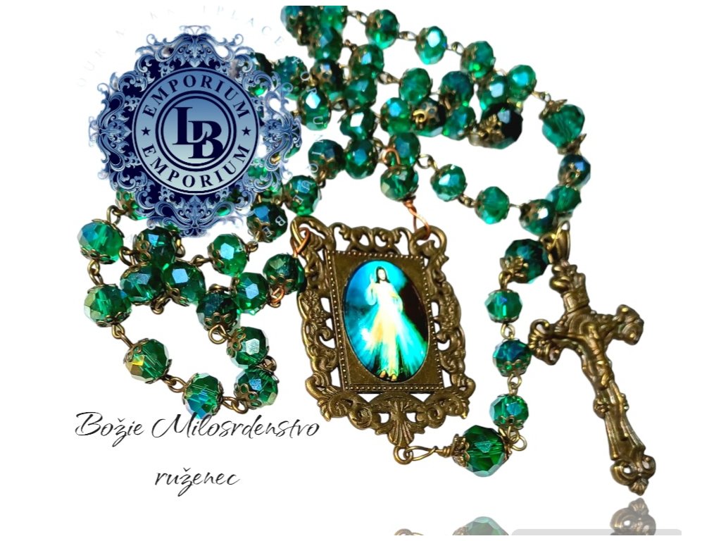Dlhý smaragdovo zelený ručne robený ruženec s medailónom Božieho Milosrdenstva. V starožitnom štýle.