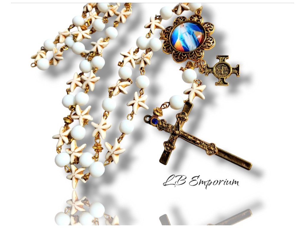 Ručne robený ruženec s medailónom Panny Márie a s obojstrannou Benediktínskou Medailou.