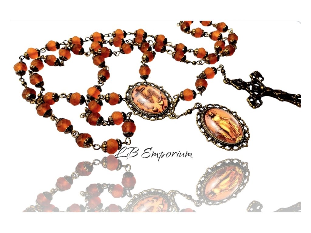 Ručne robený hnedý ruženec v starožitnom štýle, so Zázračnou Medailou Panny Márie.