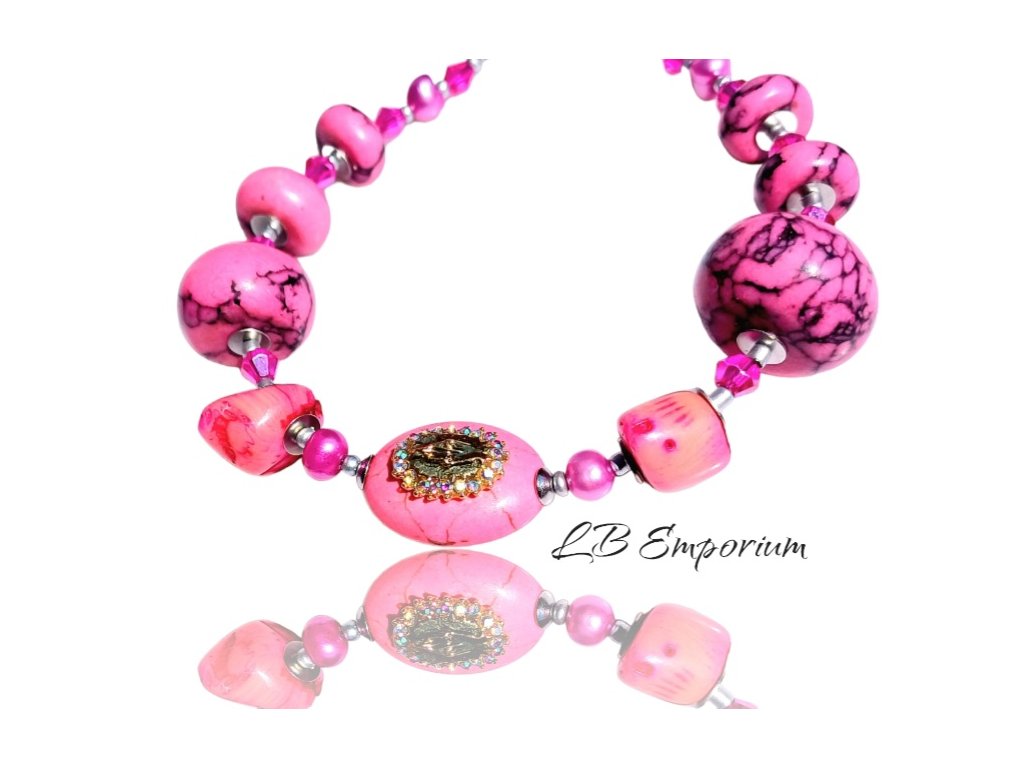 Ružový autorský ručne robený náramok s medailónom Panny Márie. Na zapínanie. Chirurgická oceľ.