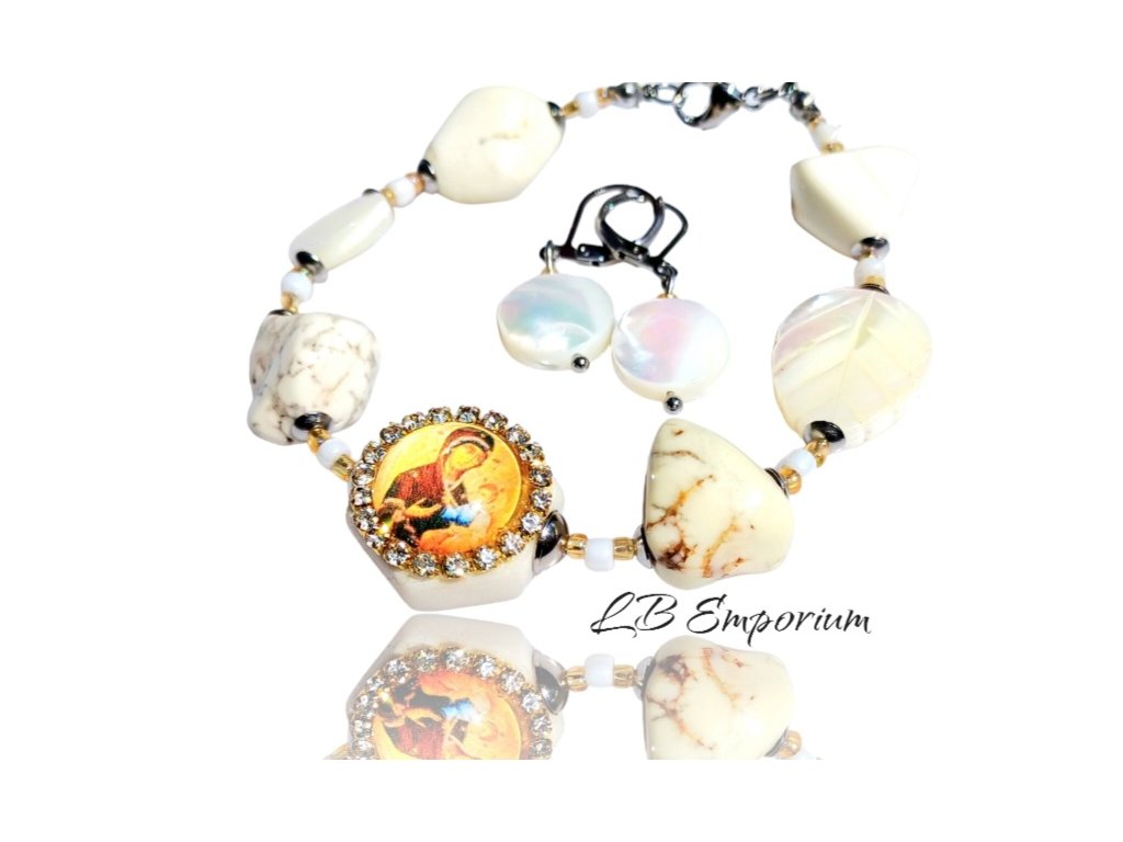 Panna Mária Ikona Matky Ustavičnej Pomoci. Set bieleho náramku a náušníc z prírodných perál. Z chirurgickej nehrdzavejúcej ocele. Autorský set, ručne robený. Len jeden set dostupný. Veľkosť sa dá nastaviť. Prosím uveďte v správe akú veľkosť potrebujete cca.