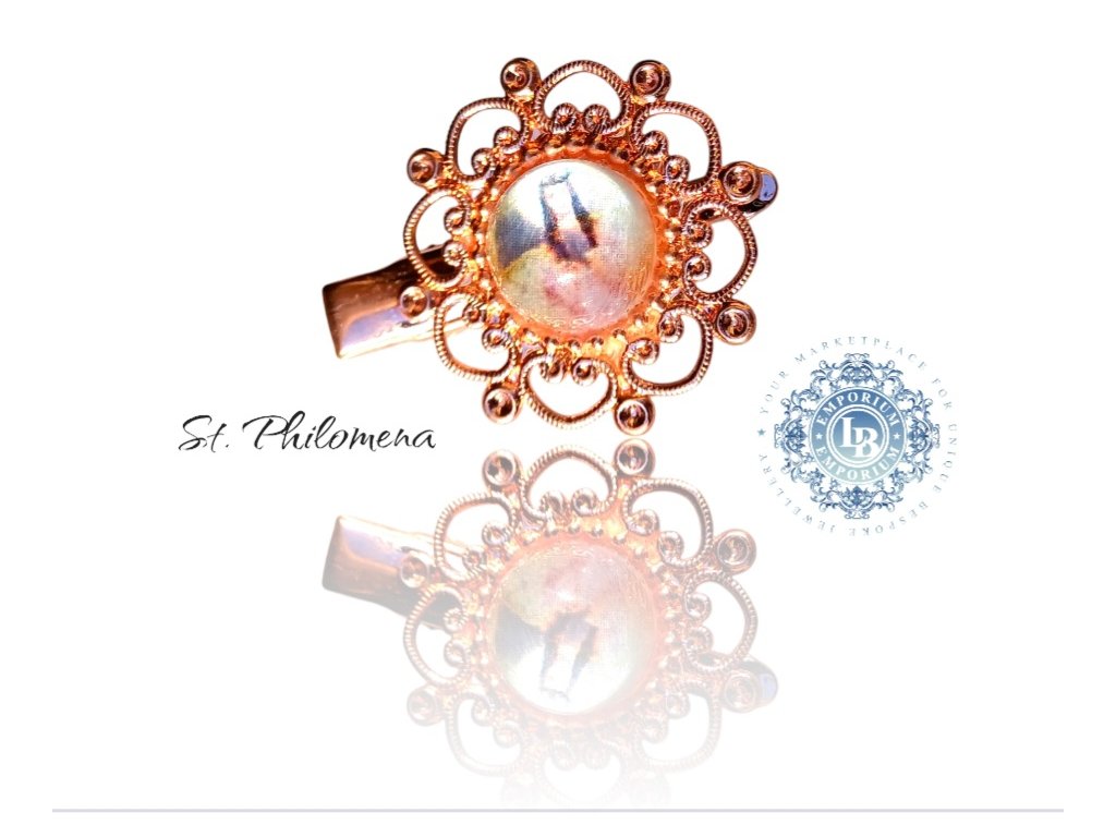 Spona do vlasov medená s medailónom svätej Filomeny.