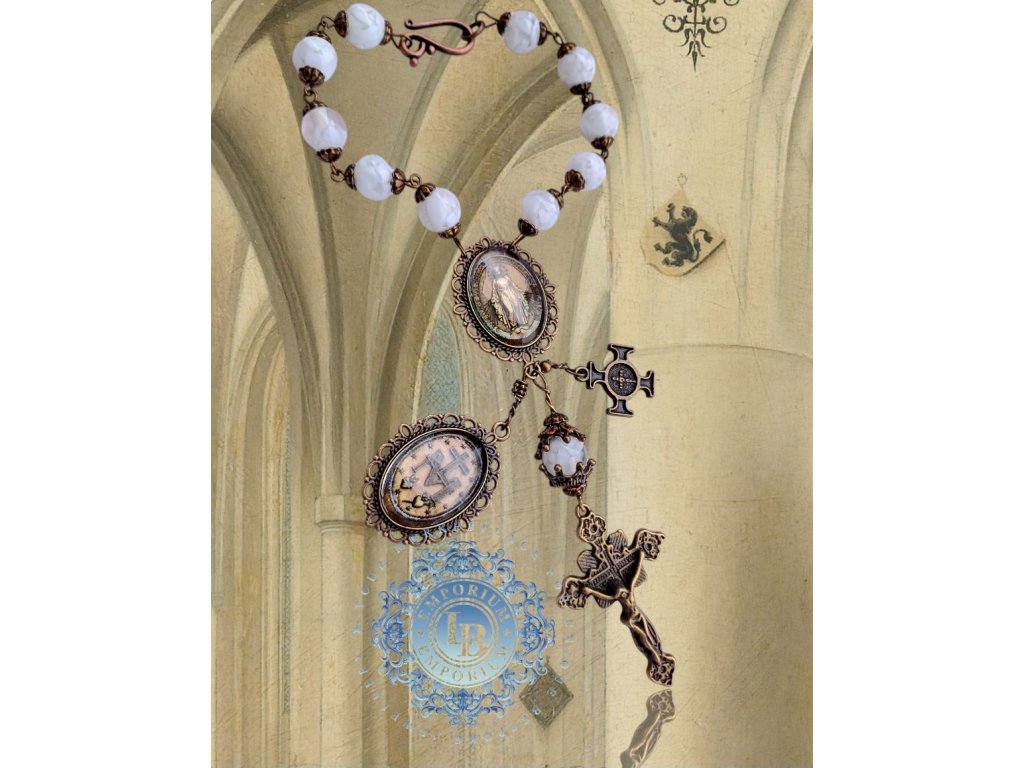 Ručne robený bronzový ruženec s medailónom Zázračnej Medaily Panny Márie, v starožitnom štýle. Na zapínanie.
