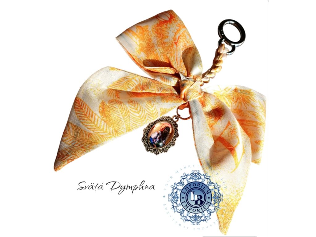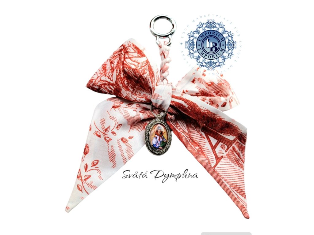 Svätá Dymphna patrónka dobrého psychického a mentálneho zdravia. Kľúčenka, prívesok na kabelu / baťoh s veľkou mašľou.