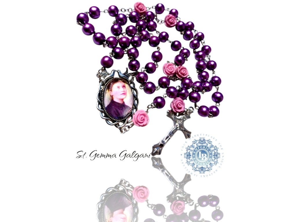 Svätá Gemma Galgani ručne robený fialový perlový ruženec s ružami.
