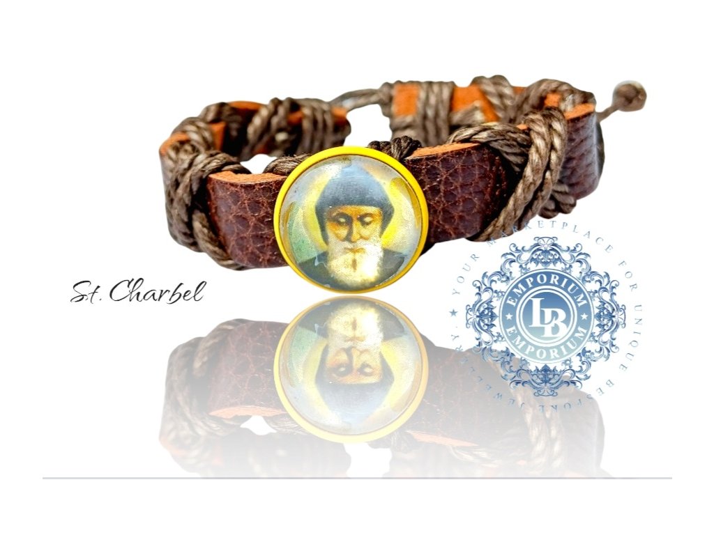 Náramok z pravej kože s medailónom svätého Charbela. Nastaviteľná veľkosť.