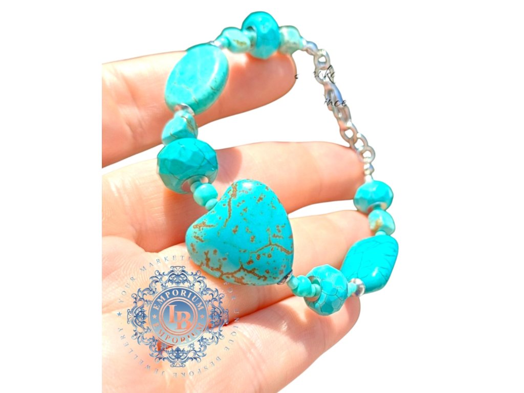 Ručne robený tyrkysový náramok so srdiečkom. Na zapínanie. Materiál: prírodné kamene a chirurgická nehrdzavejúca oceľ. Vhodný aj do vody.